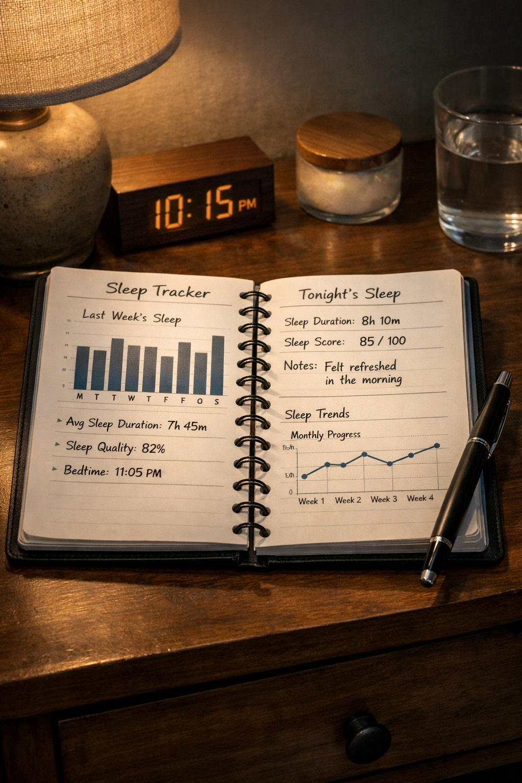 No screens 30 min before bed | Phone charges outside bedroom | Reduces blue light stimulation |